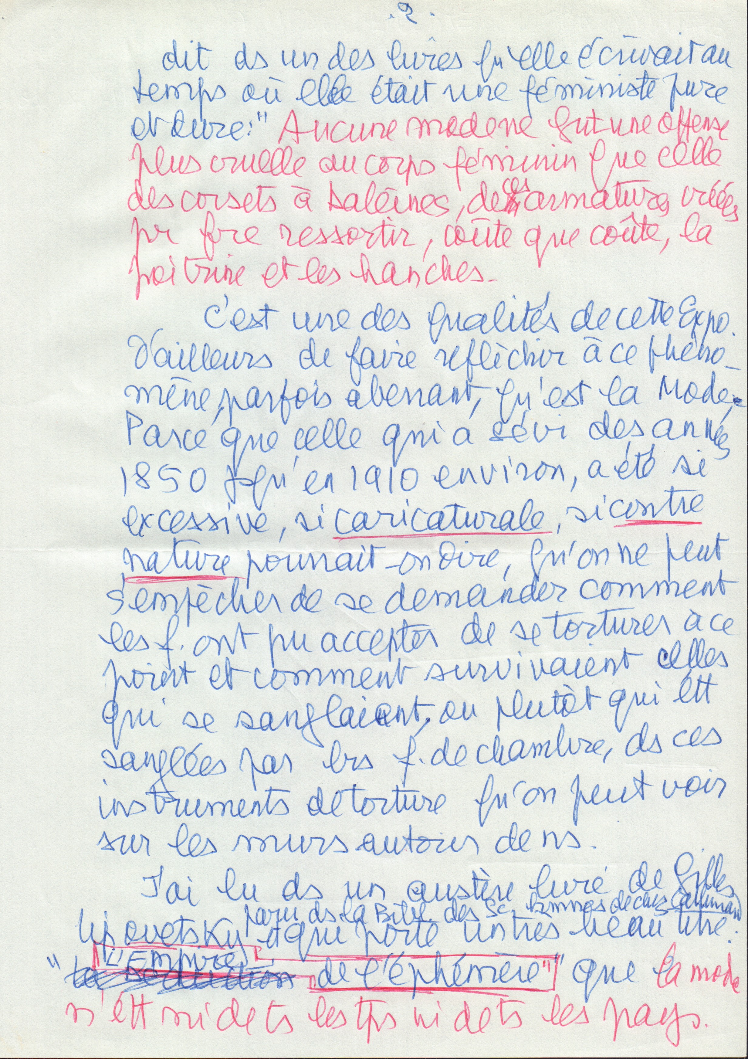 dit dans un des livres qu'elle écrivait au temps où elle était une féministe pure et dure: "Aucune mode ne fut une offense plus cruelle au corps féminin que celle des corsets à baleines, de ces armatures créées pour faire ressortir, coûte que coûte, la poitrine te les hanches.