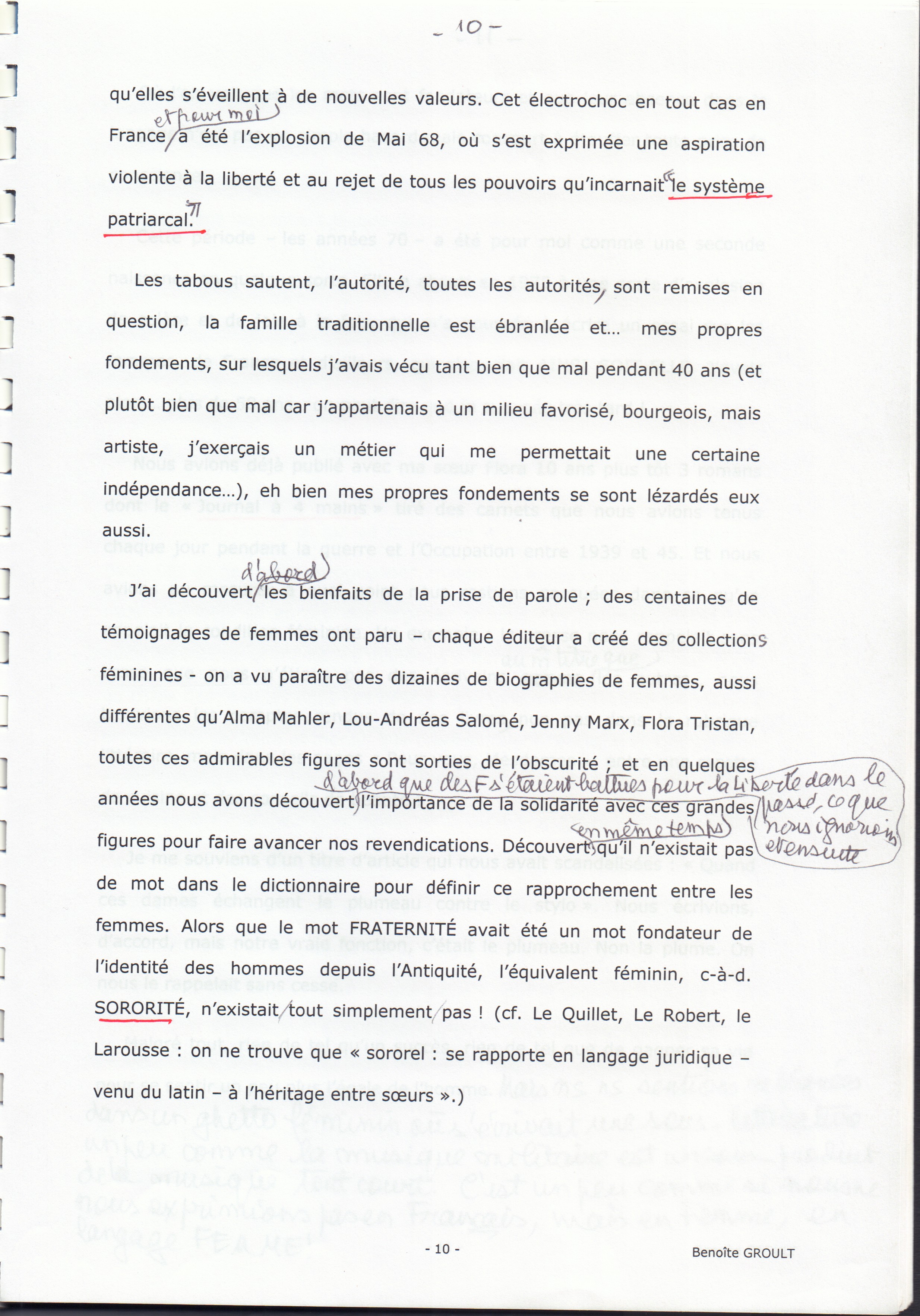 J'ai découvert d'abord les bienfaits de la prise de parole ; des centaines de témoignages de femmes ont paru - on a vu paraître des dizaines de biographies de femmes,aussi différentes qu'Alma Malher, Lou-AndréasSalomé, Jenny Marx, Flora Tristan, toutes ces admirables figures sont sorties de l'obscurité ; et en quelques années nous avons découvert d'abord que les F s'étaient battuespour la liberté dans le passé, ce que nous ignorions et ensuitel'importance de la solidarité avec ces grandesfigures pour faire avancer nos revendications.Decouvert en même temps qu'il n'existait pas de mot dans le dictionnaire pour définir ce rapprochement entre les femmes. Alors que le mot FRATERNITE avait été un mot fondateur de l'identité des hommes depuis l'Antiquité, l'équivalent féminin, c-à-d. SORORITE, n'existait tout simplement pas ! (cf.Le Quillet, Le Robert, le Larousse : on ne trouve que "sororel : se rapporte en langage juridique - venu du latin - à l'héritage entre soeurs".)